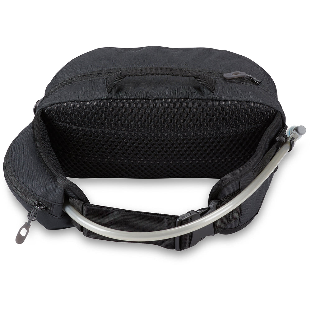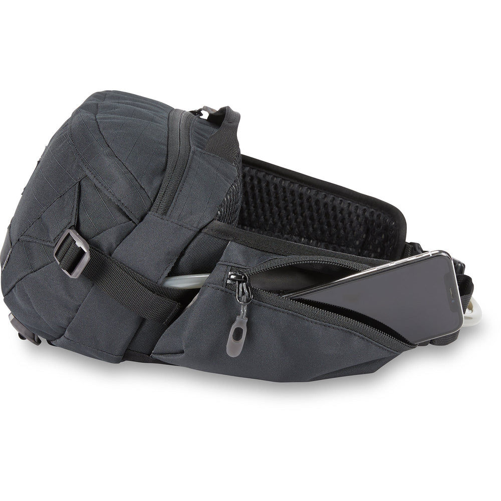 With storage capacity comparable to small backpack-style options, Hot Laps 5L is a capable hip pack, complete with two-liter Hydrapak® 3D lumbar reservoir and additional space to stow a gamut of gear on your rides. Its redesign now provides a fleece-lined pocket on the padded hip belt to conveniently stow a phone or sunglasses. The main compartment features organization for tools, food, and a light shell, while lower straps deploy to hold pads. Side compression straps keeps the load close as the water reservoir is emptied, and a breathable AirFlow back panel does away with hotspots and minimizes sweat.